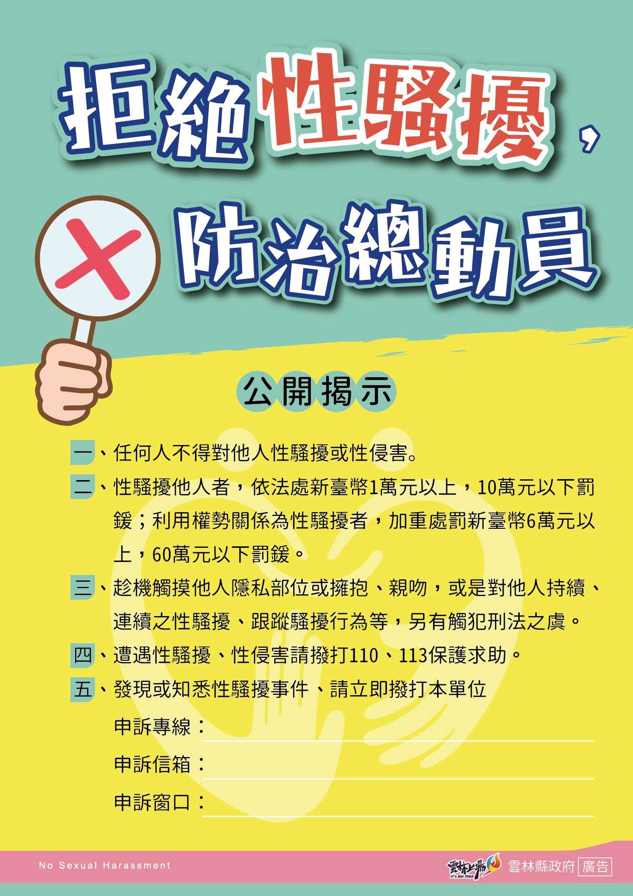 114年農業處性平宣導成果介紹 1.植樹節活動辦理性平推廣宣導 2.處務會議科務會議性平宣導撥放短影音 3.性平海報牆宣導 4.布告欄公佈欄性平宣導 5.LINE群組性平影片法令新知宣導 6.自製媒材短影音(請至網頁下方相關影音觀看):(1)農村女性向前行、(2)雲林CEDAW讚